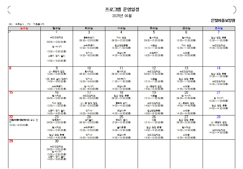 목록 2025년 6월 프로그램 일정 페이지 정보 최고관리자 2025-06-11 163 회 0 건 본문 2025년 6월 프로그램 일정 입니다. 이전글2025년 7월 프로그램 일정표 다음글2025년 5월 프로그램 일정표